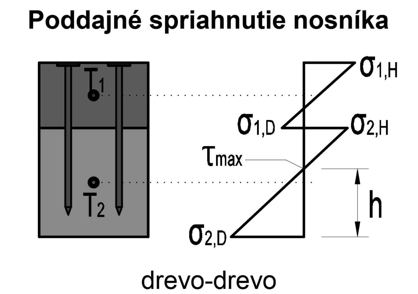 Poddajné spriahnutie drevo-betónového nosníka je riešené ako štádium t0=28 dní, bez zohľadnenia vplyvu zmrašťovania betónovej membrány. Vplyv zmrašťovania je možné vyjadriť obdobným spôsobom ako pri spriahnutých oceľobetónových nosníkoch. Účinok zmrašťovania môžeme vyjadriť dvomi etapami modelovaného nosníka.